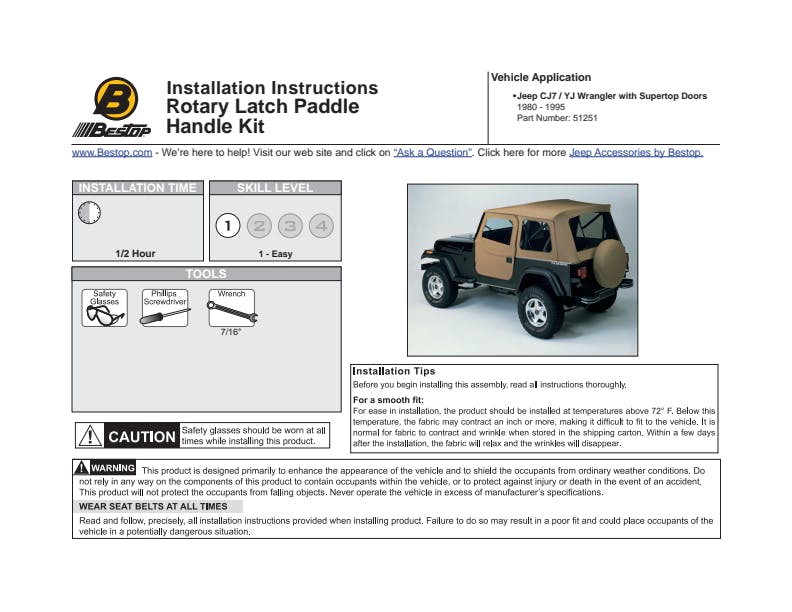 Specifically for 1987-1995 Wrangler YJ with round door striker pins and close using rotary latch design for a solid, secure closure.