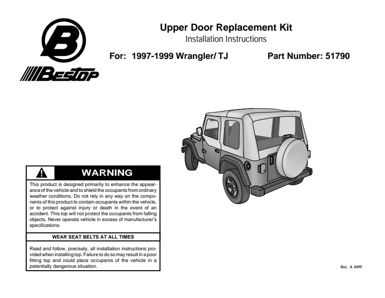 - Note: Bestop Upper Door Kits cannot be used in conjunction with Bestop Lower Fabric Half Doors. If you are interested in combining upper and lower doors, check out our 2-Piece Fabric Door Kits