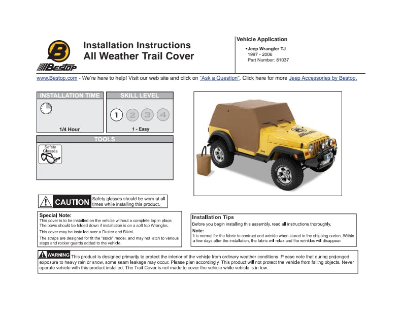Bestop All Weather Trail Covers are a necessity when you get caught without your soft top. A Trail Cover provides peace of mind that you've got a backup plan when unexpected weather hits and the soft top is at home. Or maybe you just don't want the soft top on at all and Trail Cover is your interior's protection against harsh effects of sun, wind and rain. Every Jeep owner needs a Trail Cover - it will come in handy when you need it.