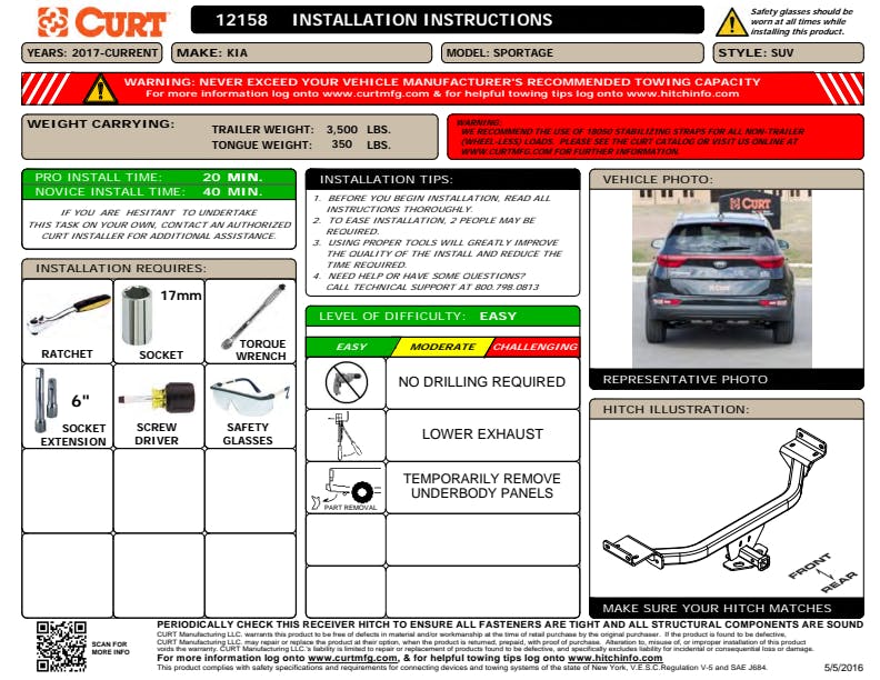 A CURT trailer hitch is the key to pursuing your passions, whether you're taking the family boat out for an afternoon on the water or packing up the mountain bikes for a day on the trails. This CURT class 2 hitch is perfect for towing a small trailer, such as a boat trailer, lightweight camper or utility trailer. It can also be used to mount a hitch cargo carrier or bike rack (never exceed the lowest-rated towing component). Like all CURT custom hitches, this class 2 trailer hitch is made for a vehicle-specific fit. It is engineered to seamlessly integrate with select years of the Kia Sportage (see application info to verify fitment). It is rated for 3,500 pounds gross trailer weight and 350 pounds tongue weight. It is also equipped with 1-1/4" x 1-1/4" hitch receiver to accept the included ball mount. The ball mount that comes with this hitch kit has a 3/4" trailer ball hole and can be positioned in the drop or rise orientation for level towing with your specific trailer (trailer ball not included). Like all CURT custom receiver hitches, this class 2 hitch is designed, manufactured, finished and tested with the utmost care. It is engineered for a precise fit, easy installation, maximum towing strength and an integrated look on the vehicle. It is also tested to SAE J684 protocols for safety. This class 2 trailer hitch is finished with our industry-leading dual-coat process for unparalleled rust, chip and UV resistance. It is descaled for a smooth surface, submersed in liquid A-coat for rust prevention inside and out, covered with a highly durable powder coat, and finally co-cured for a dependable shield against the elements. This class 2 hitch comes with a ball mount, hitch pin and mounting hardware for a complete installation.