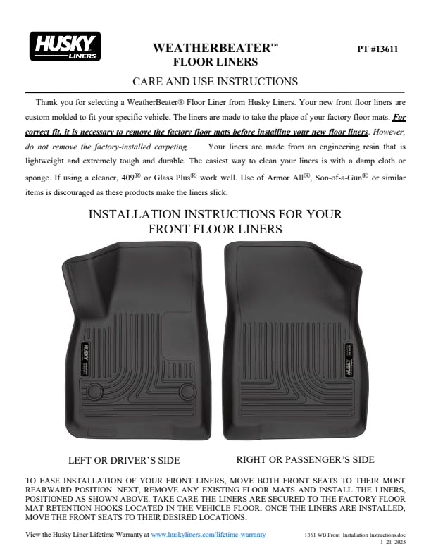 Expand the Husky Liner protection you love from bumper to bumper, with Weatherbeater? Cargo Liners. These all-weather, any-conditions liners are ready for anything you throw in the back and stand up to even the toughest spills. Husky?s rubberized DuraGrip? surface and ProGard? formula keep cargo protected with durable flexibility, and no shifting around. Installs in minutes and stays in place until you?re ready to take out and clean. Available in black, gray, or tan for a factory look to match your vehicle?s interior. Backed by Husky Liners Guaranteed for Life. Proudly made in the U.S.A.