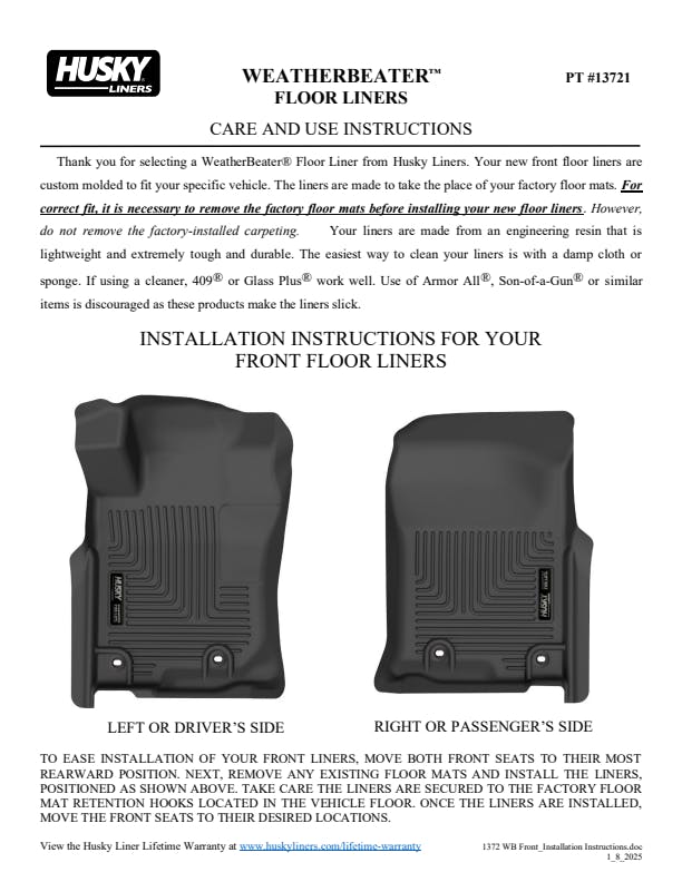 Expand the Husky Liner protection you love from bumper to bumper, with Weatherbeater? Cargo Liners. These all-weather, any-conditions liners are ready for anything you throw in the back and stand up to even the toughest spills. Husky?s rubberized DuraGrip? surface and ProGard? formula keep cargo protected with durable flexibility, and no shifting around. Installs in minutes and stays in place until you?re ready to take out and clean. Available in black, gray, or tan for a factory look to match your vehicle?s interior. Backed by Husky Liners Guaranteed for Life. Proudly made in the U.S.A.