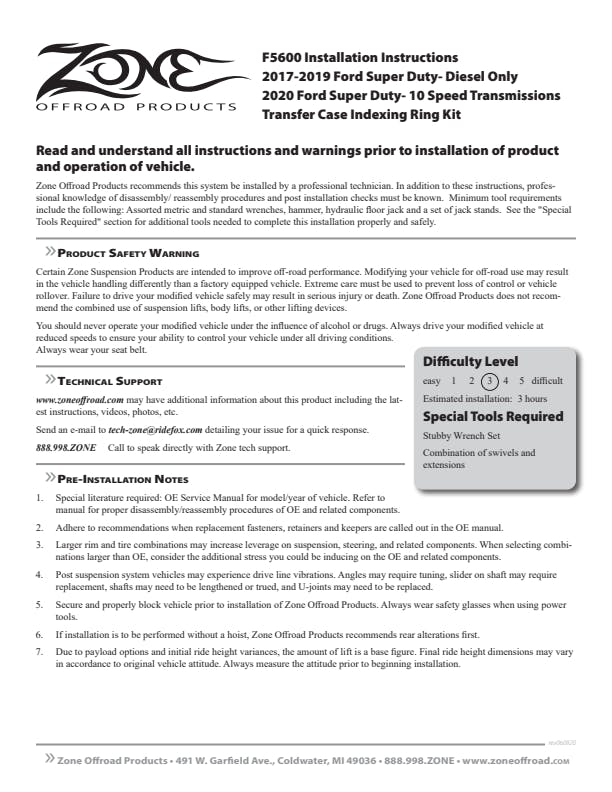 Zone Offroad is now offering new transfer case indexing ring kits for the later model 2017+ Ford Super Duty truck. Designed for applications with 6+ lift, this kit allows the use of the factory driveshafts while eliminating any potential driveline vibration caused by excessive operating angles. This kit rotates the transfer case 11 degrees to improve front driveshaft output for improved operating angle while utilizing a super stong, yet ultra thin 1/4 design for optimal spline engagement once installed. ARP studs and hardware hold the new setup in place. On the Super Duty trucks the factory transmission crossmember doesn't allow sufficient clearance for the indexed driveline so a high clearance, heavy duty crossmember is supplied built from 1/4 steel and ready to bolt into place with the supplied hardware. Set your lifted Super Duty up right with this indexing ring kit from Zone Offroad.