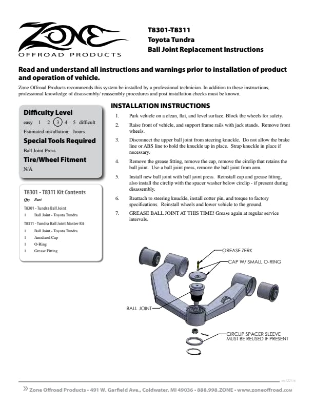 When it comes time to replace the upper ball joints in your Zone Offroad upper control arms these ball joints are an quick and easy swap. This kit Includes one (1) ball joint with nut, red anodized aluminum dust cap, O-ring, grease zerk fitting, cotter pin, and snap ring (where applicable) designed for use in the T2300 upper control arms.