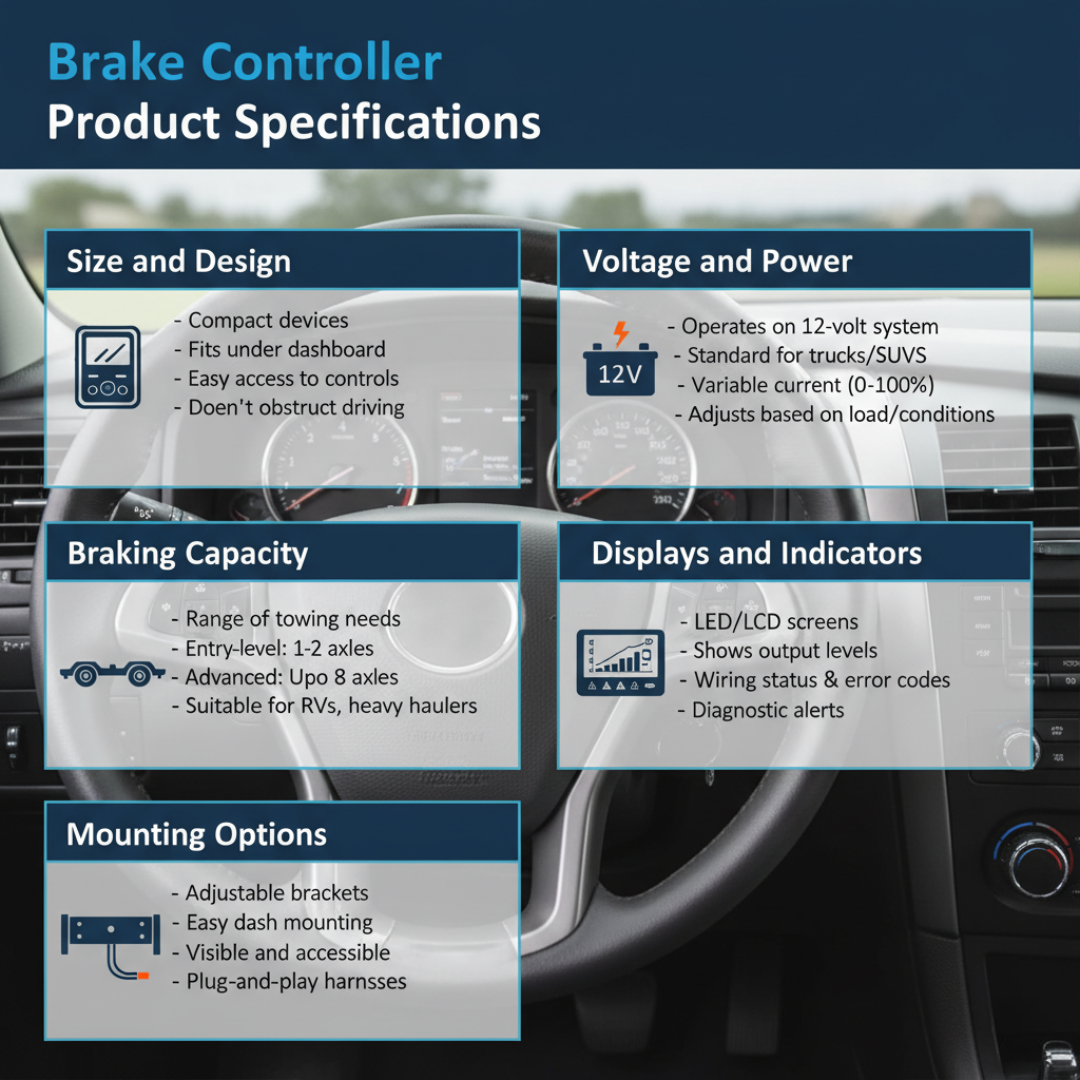 Most brake controllers operate on a 12-volt power system, which is standard for trucks and SUVs used for towing. They deliver variable current to the trailer’s electric brakes, giving drivers the ability to adjust output from 0% to full braking power based on load and driving conditions.